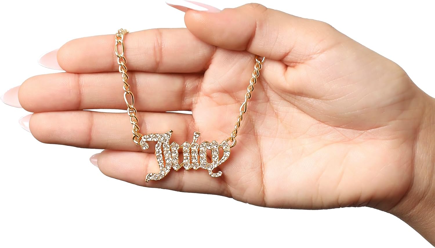 Juicy Couture Necklace for Women Gothic Logo Pendant, 18"+2" Gold-Tone Juicy Necklace with Clear Crystals