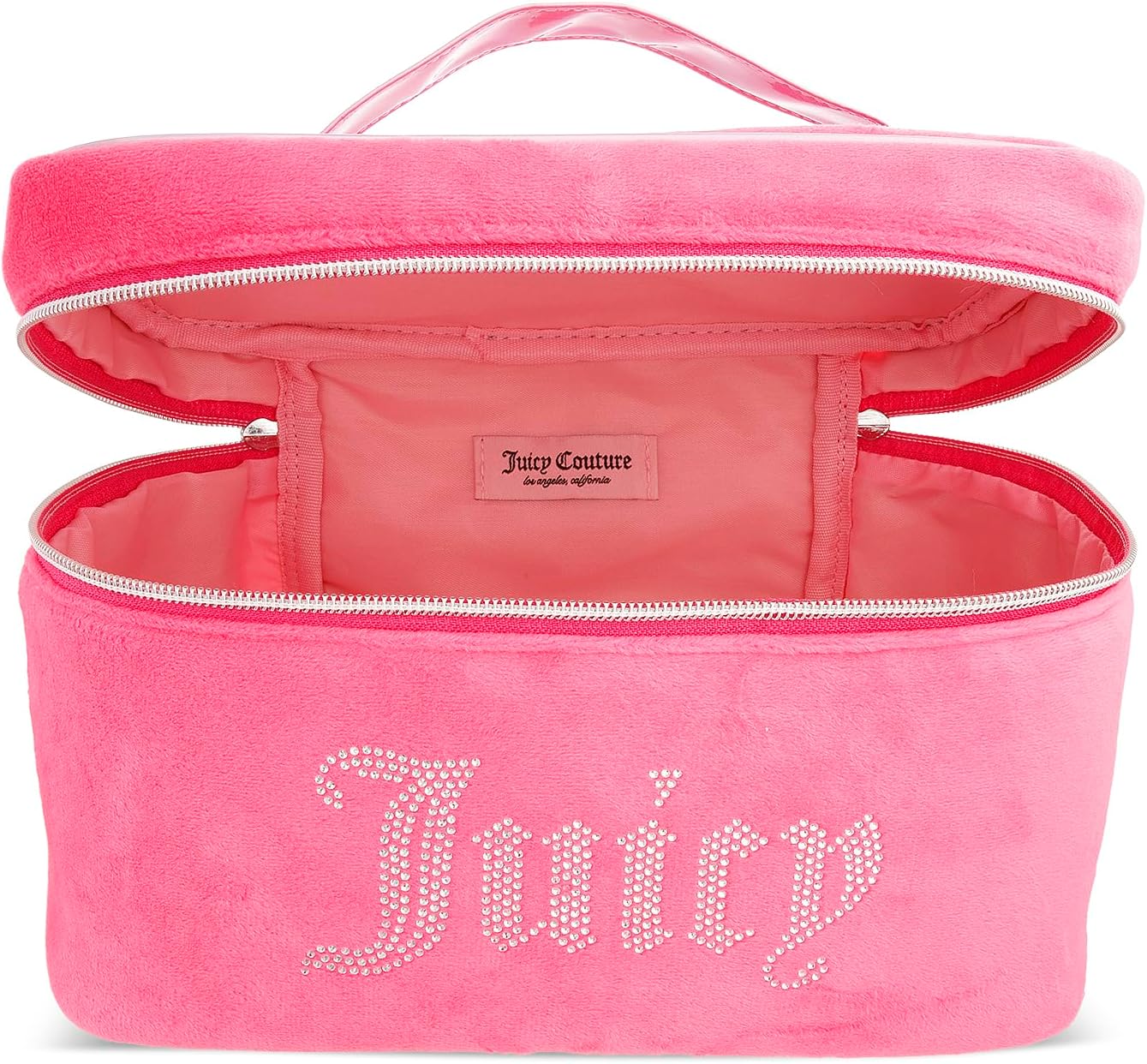 Organize your cosmetics in style with the Juicy Couture Pink Silver Makeup Bag. This travel-friendly train case features a luxurious velour exterior adorned with sparkling rhinestones. Its spacious interior keeps your beauty essentials secure and easily accessible, making it perfect for on-the-go glamour.