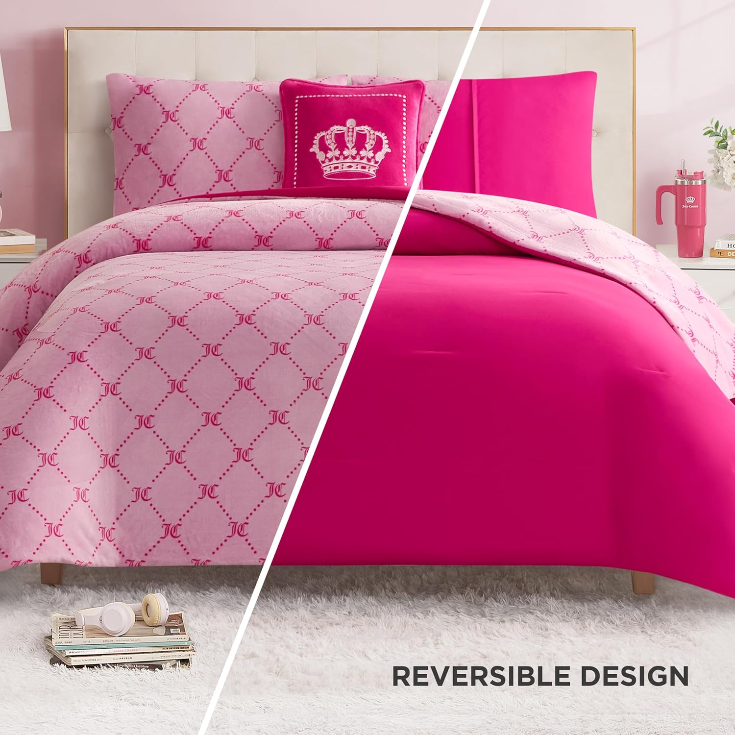 Juicy Couture Plush Reversible Trellis Link 4-Piece King Comforter Set with Decorative Pillow, Pink
