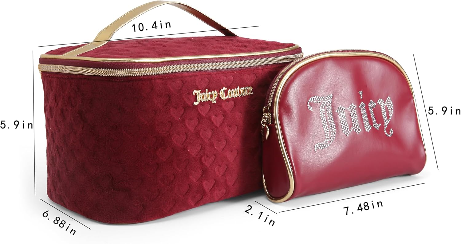 Juicy Couture Red Makeup Bag Cosmetics Organizer Travel Essentials Train Case Coin Purse Velour Heart Faux Leather Rhinestone