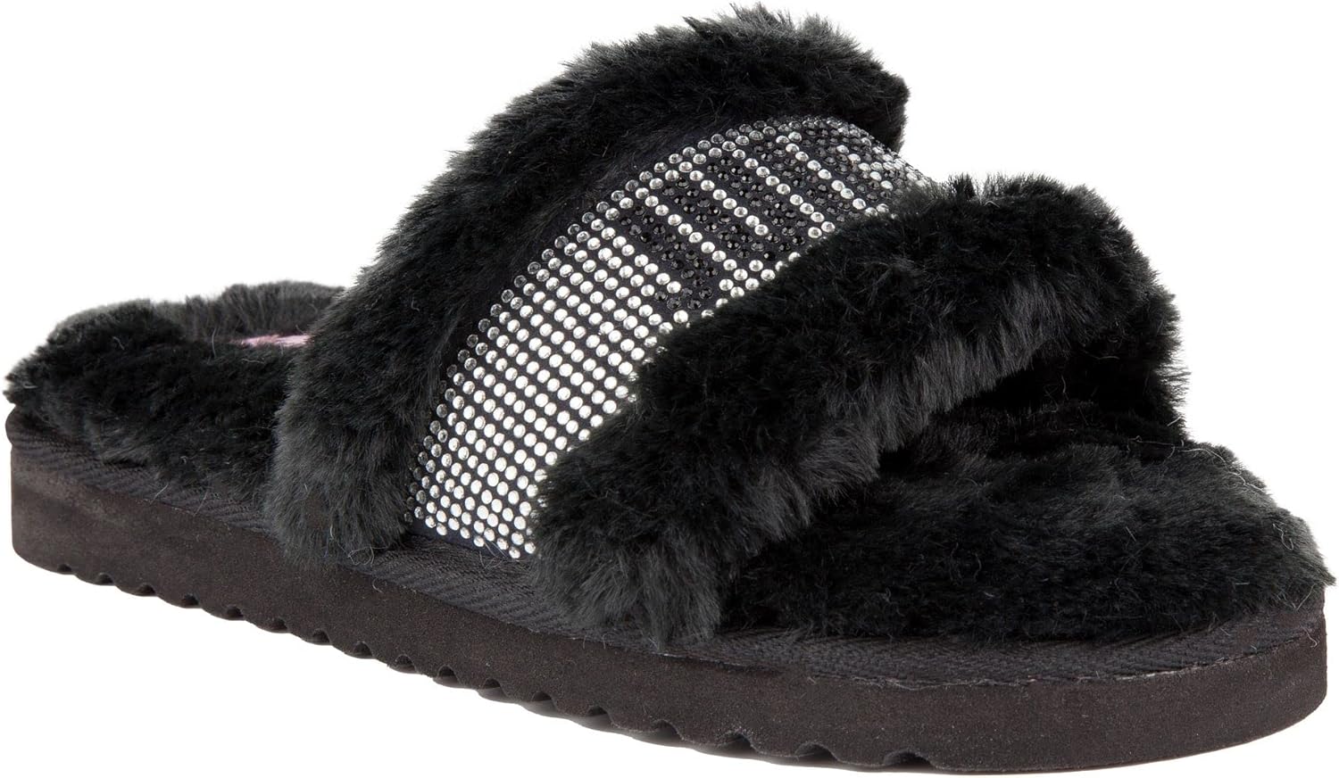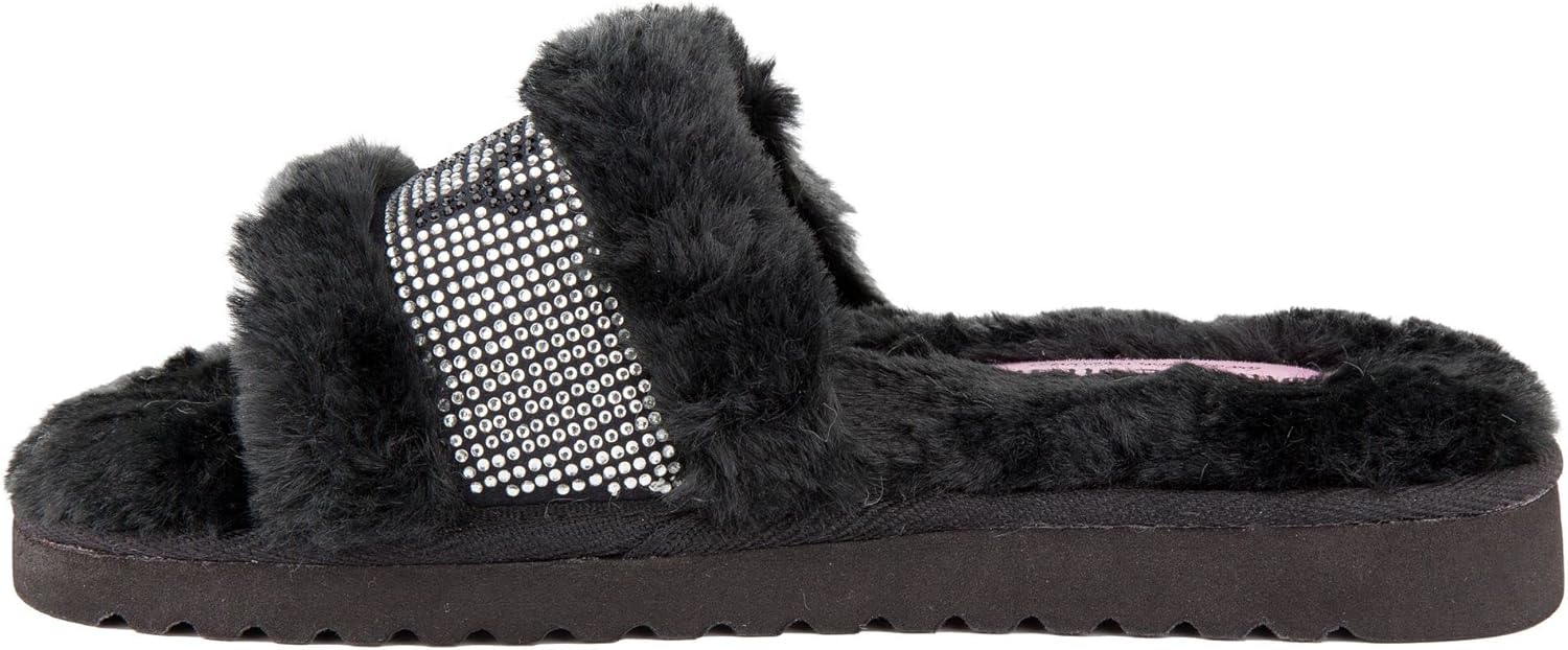 Juicy Couture Women’s Luxe Faux Fur Slide Slippers with Embellished Strap, Cozy Indoor/Outdoor Fuzzy Slip-On Sandals