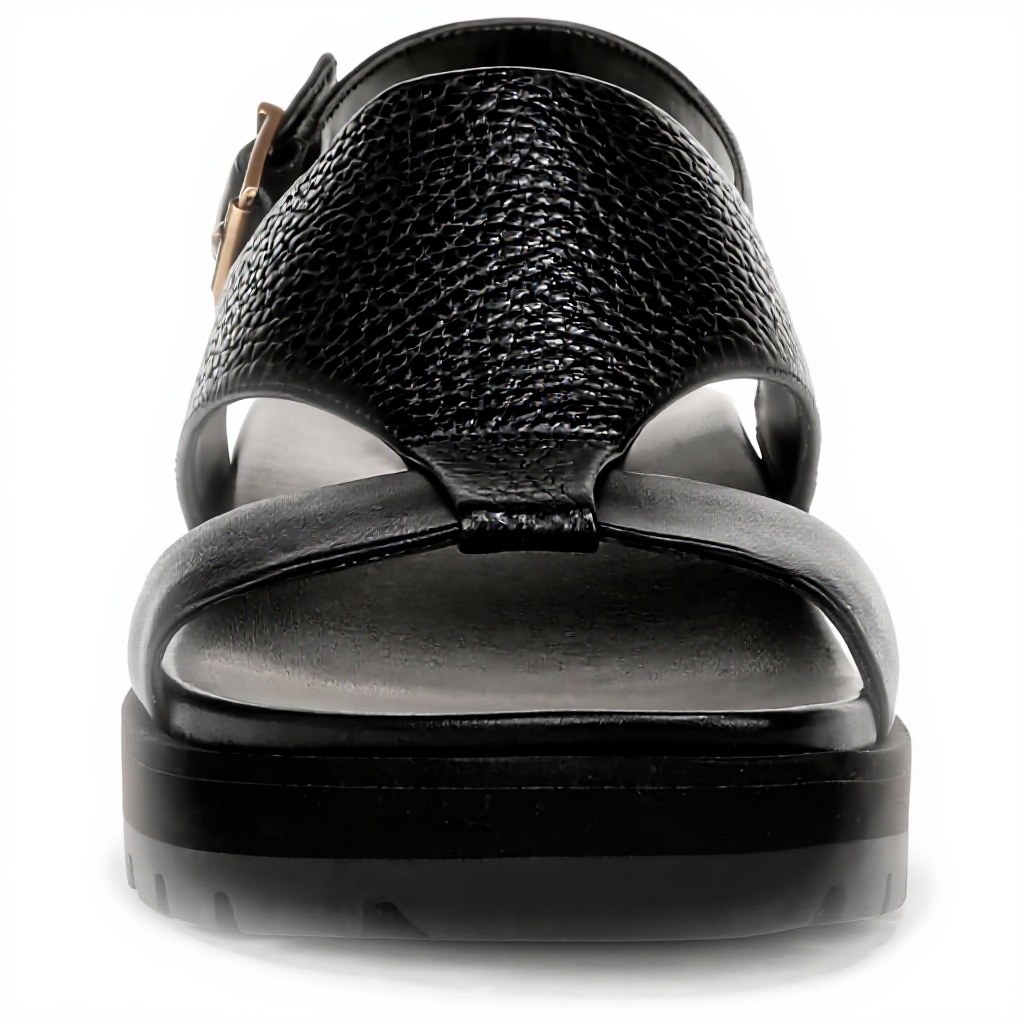 Available in UK sizes ranging from 3 to 9, including half sizes, these sandals ensure a precise fit. The item model number is I9855L1002, and they are crafted from high-quality black leather. Lightweight and durable, they are designed for long-lasting wear and easy maintenance.