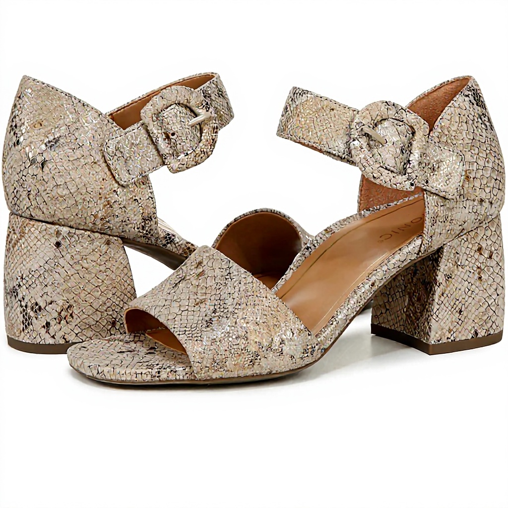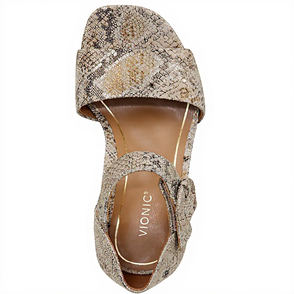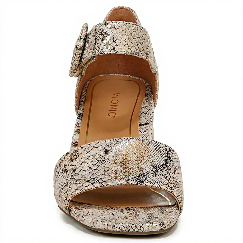 The Vionic Chardonnay Heeled Sandal combines fashion-forward design with advanced foot support technology. Featuring Vio Motion technology, these sandals provide exceptional stability, cushioning, and arch support while maintaining flexibility for natural foot movement. Available in premium materials including leather, suede, and exotic snake-print options.